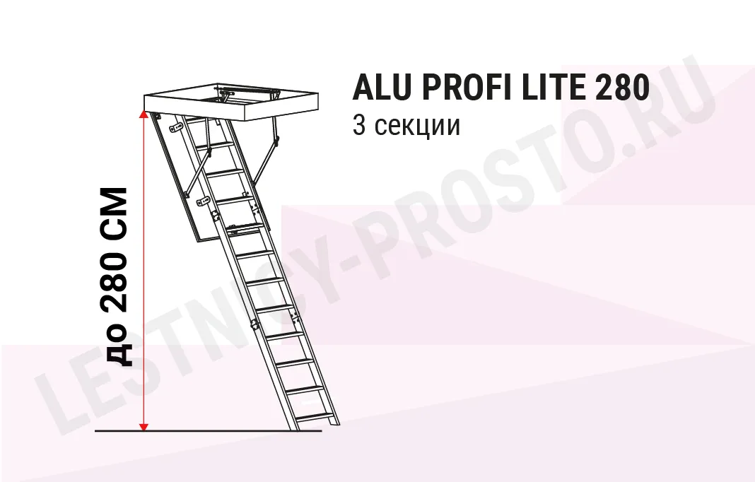 Складная 3-х секционная чердачная лестница. Рабочая поверхность полностью выполнена из алюминия. Термоизоляционная крышка типа "сэндвич" имеет усиленную теплозащиту, облицована с двух сторон ДВП белого цвета. По контуру короба имеется уплотнитель; Все металлические элементы лестницы покрыты порошковой краской.