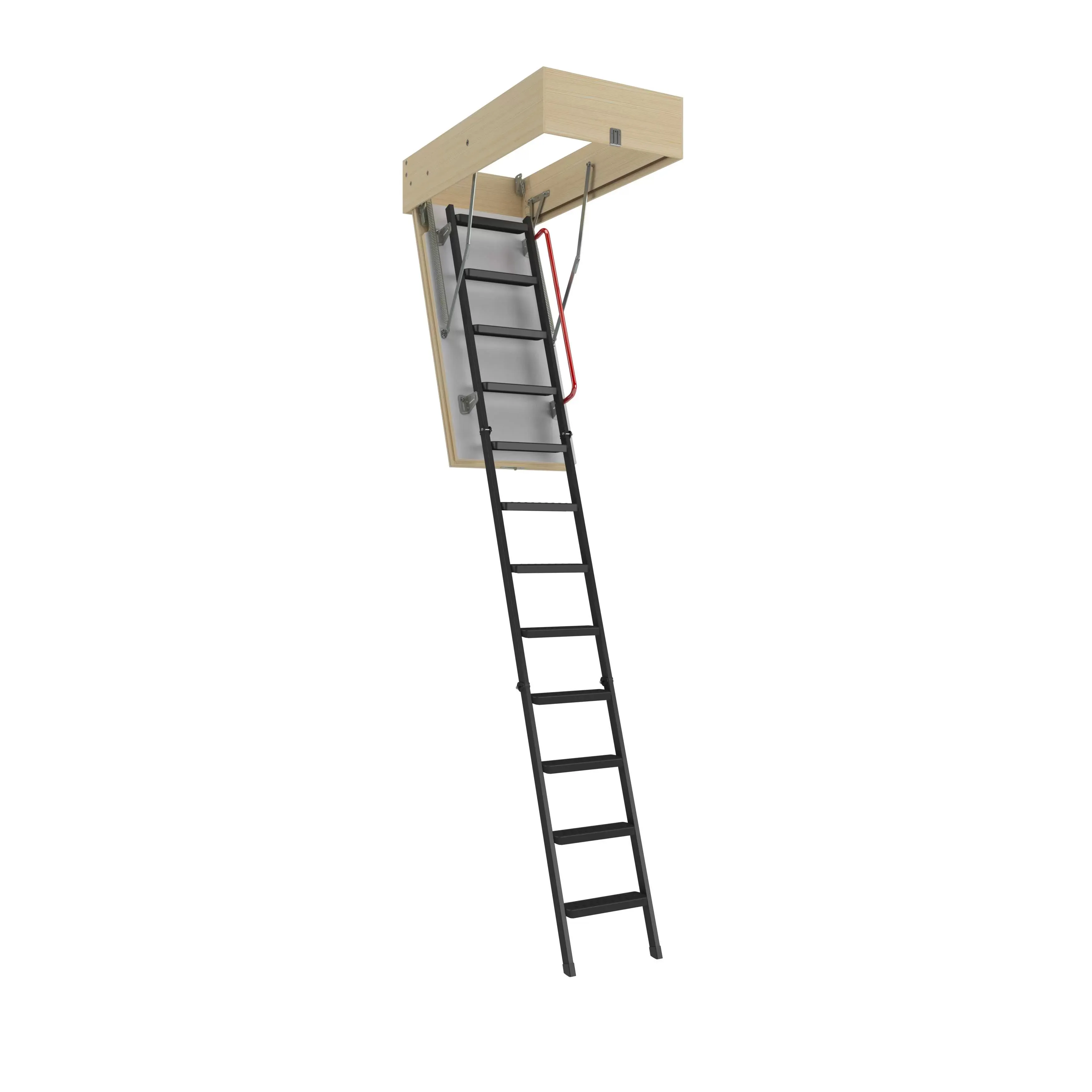 Лестничный марш выполнен из металла, покрытого порошковой краской, на ступенях сделаны специальные противоскользящие насечки. Для максимального комфорта и безопасности подъема лестница оснащена боковым металлическим поручнем красного цвета. Для правильного и быстрого монтажа рекомендуется дополнительно приобретать монтажный комплект LXK.
