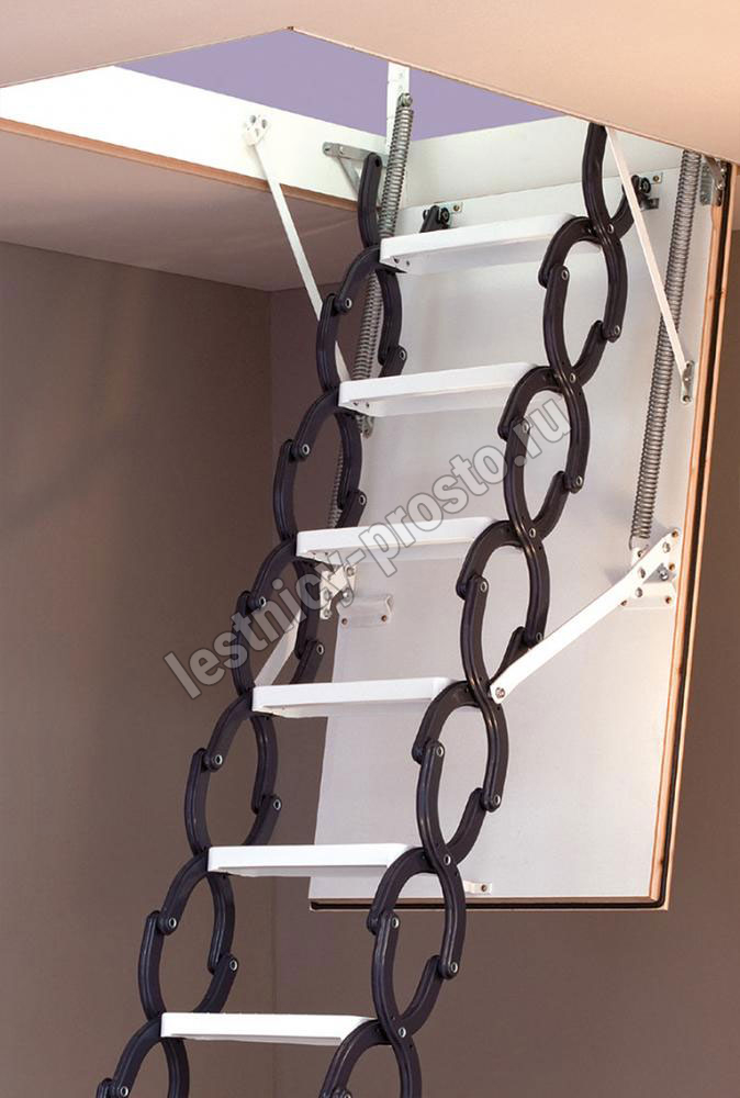 Все металлические элементы, петли, пружины, кронштейны, ручка, стальные ступени обработаны и защищены порошковым покрытием, оберегающим лестницу от механических повреждений при частом использовании.