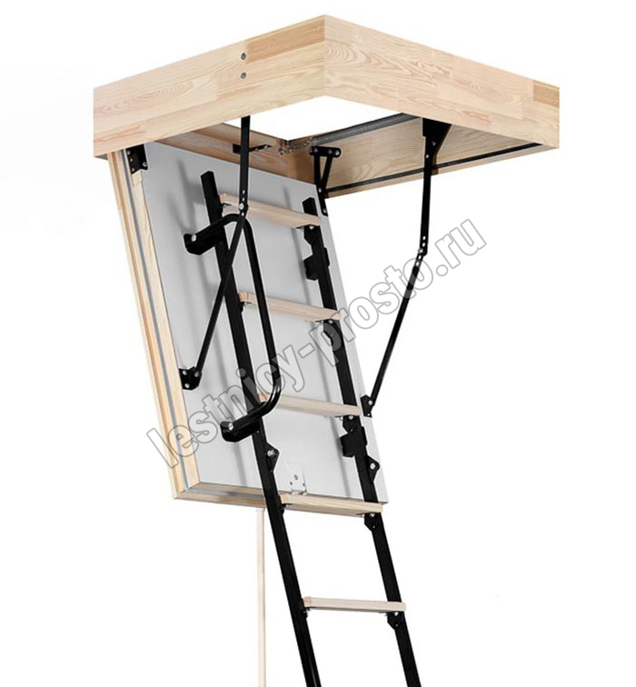 Термоизоляционная крышка имеет усиленную теплозащиту, облицована с двух сторон ДCП белого цвета. В комплекте деревянный стержень для открывания, металлический поручень и защитные накладки на ножки. Лестница идеальна для прохода на холодный чердак.