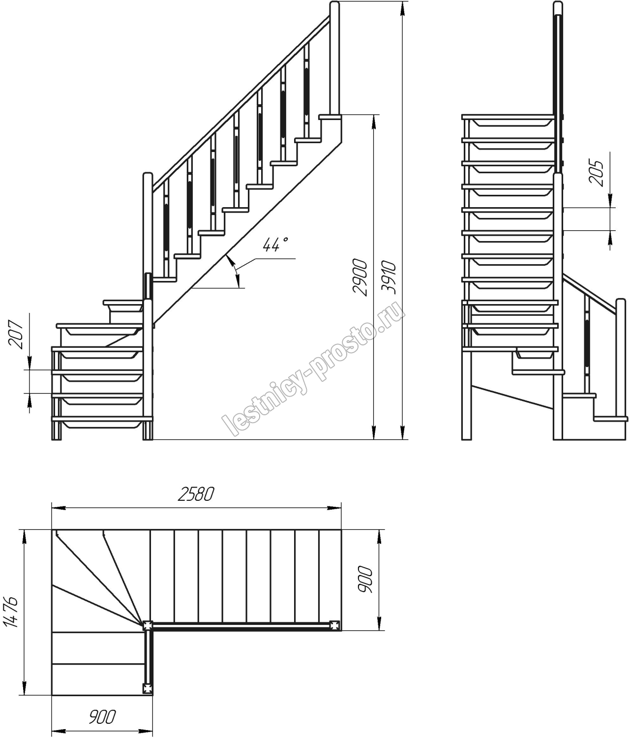 Удобная лестница на косоурах с поворотом на 90 градусов. Открытые ступени визуально облегчают конструкцию. Ограждения по всему маршу обеспечивают дополнительную безопасность и возможность декорирования. Монтаж осуществляется силами двух человек на объекте по указаниям, приведенным в паспорте на лестницу.