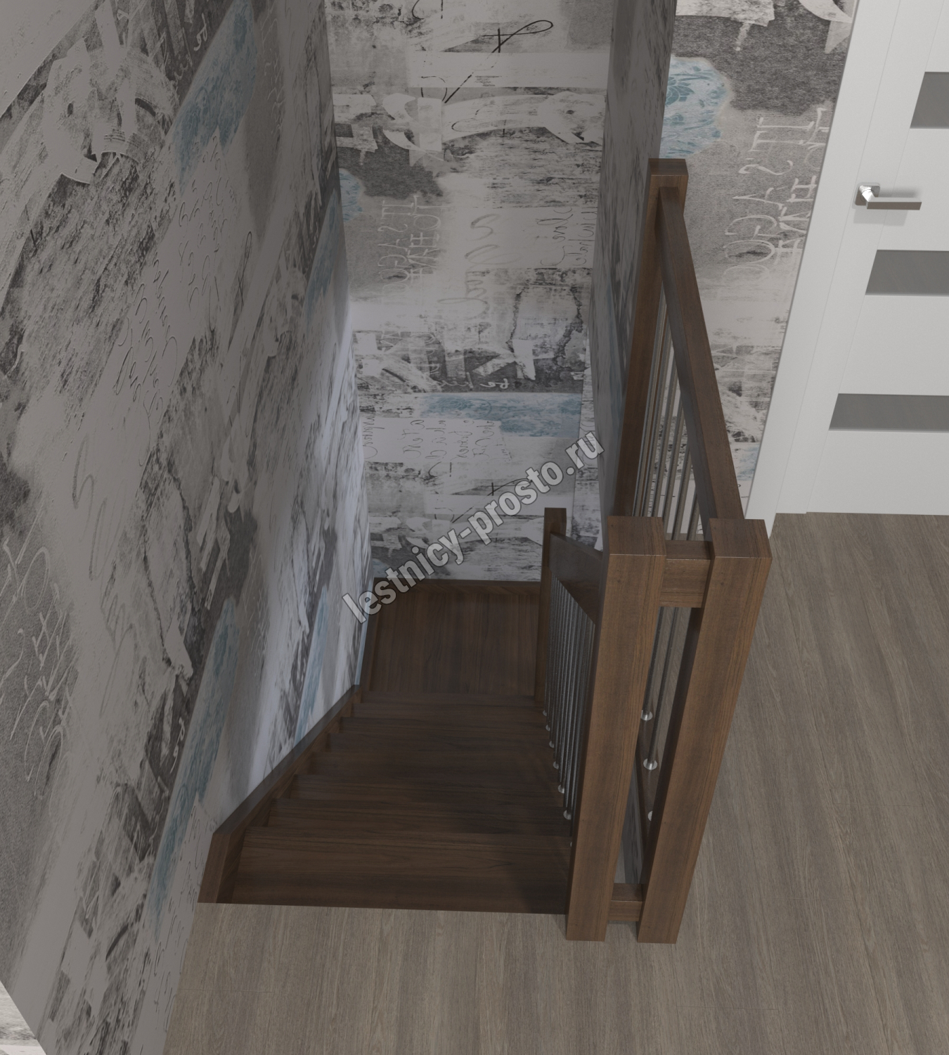 Вид лестницы по реализации поворота: с поворотом на 90° через площадку, с поворотом на 90° через 4 забежные ступени;