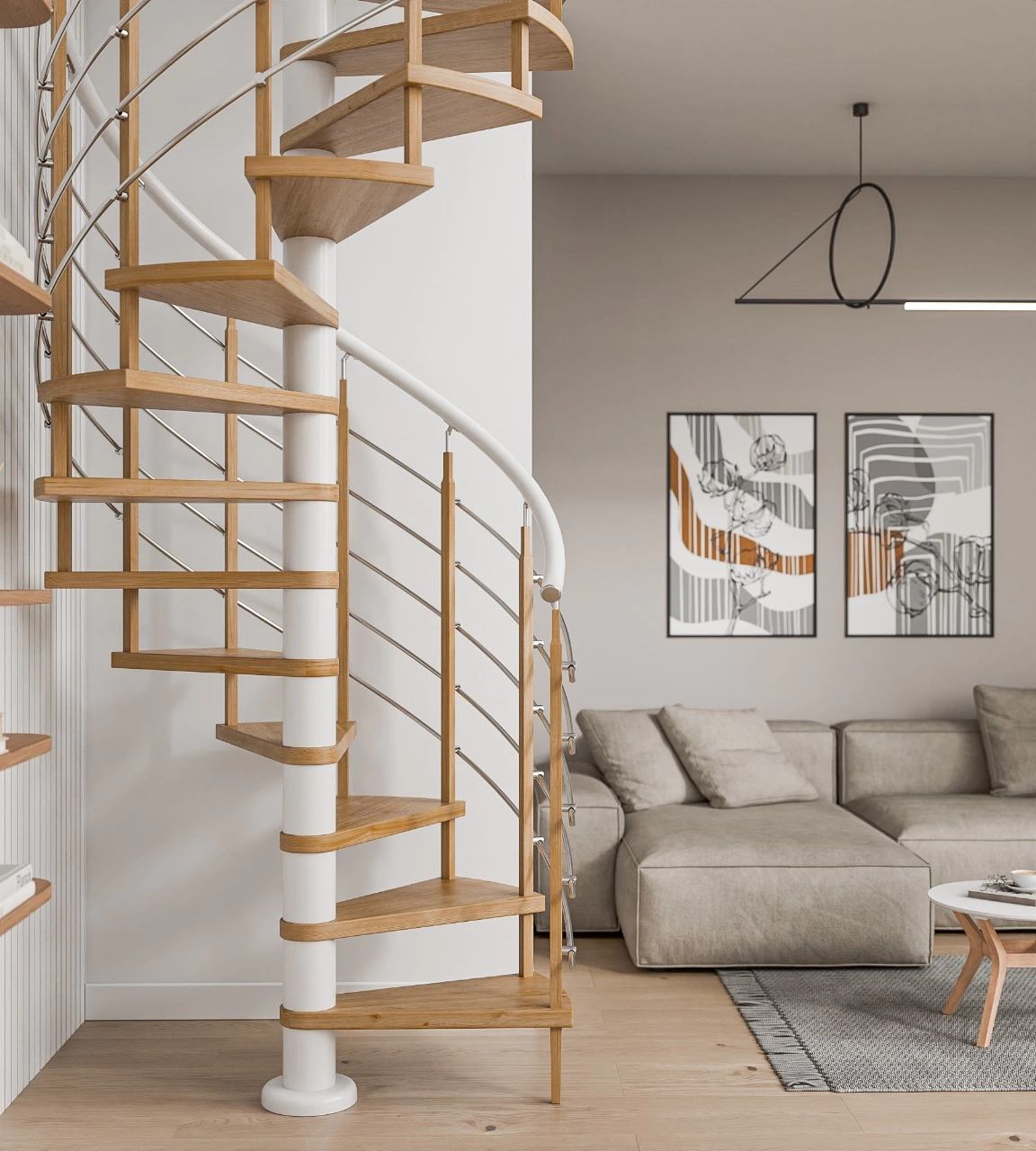 Деревянные элементы: столбы и поручень по умолчанию идут без окрашивания, металлические элементы окрашены в цвет каркаса лестницы. Ограждение начинается с пятой ступени. Комплект предполагает размещение по  одной стойке на ступень.