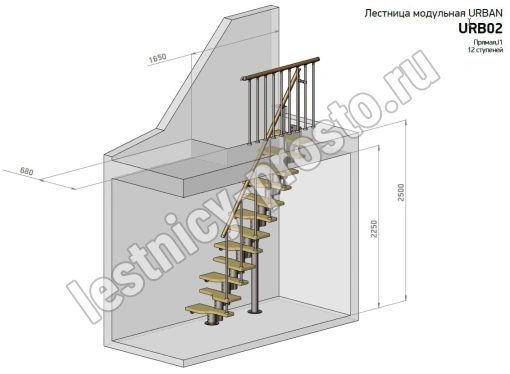 Лестница Prosto Urban Black гусиный шаг 700 мм с поручнем ПВХ, h234-336 см (13 ступеней), берёза мультиплекс