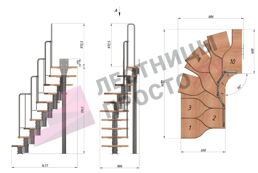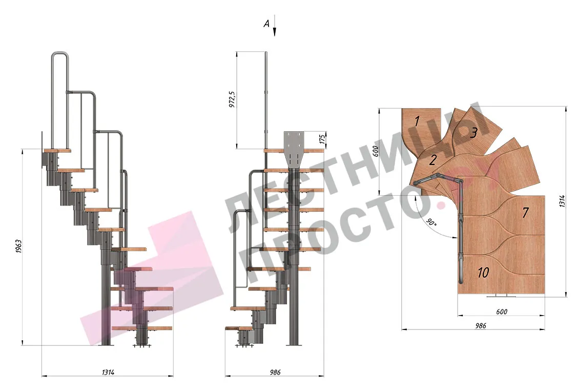 Лестница Prosto Urban Grey г-образная гусиный шаг 600 мм/ Ступени из берёзы мультиплекс