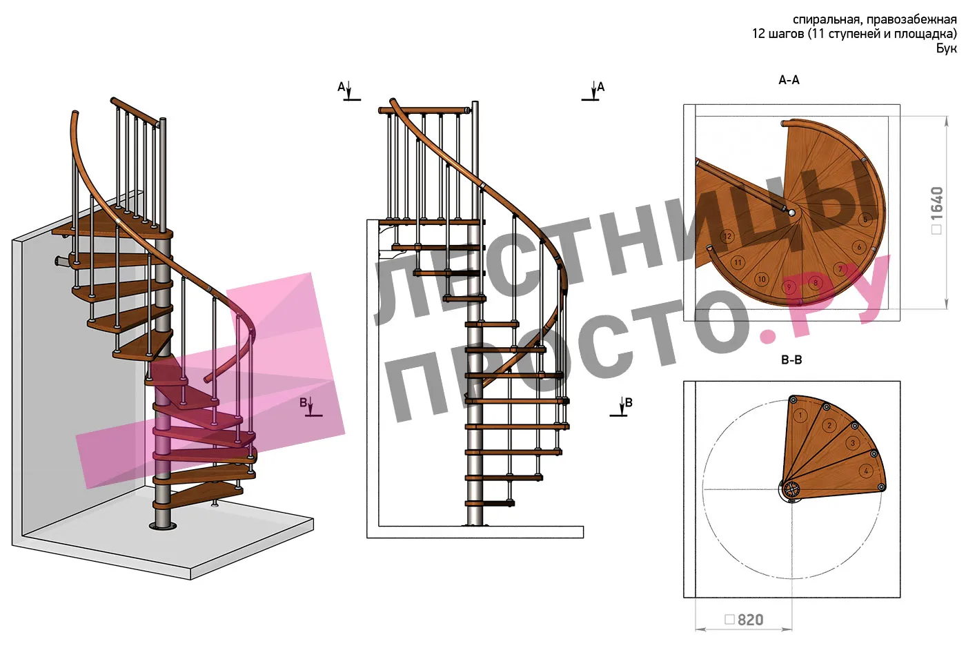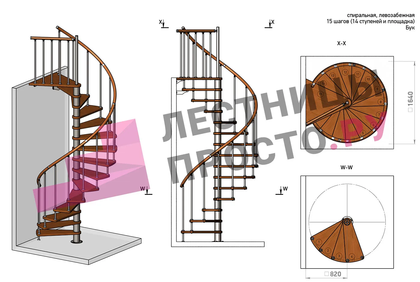 | Винтовая лестница Prosto Spiral Black D140см, h282.2-326,3 см, бук |
