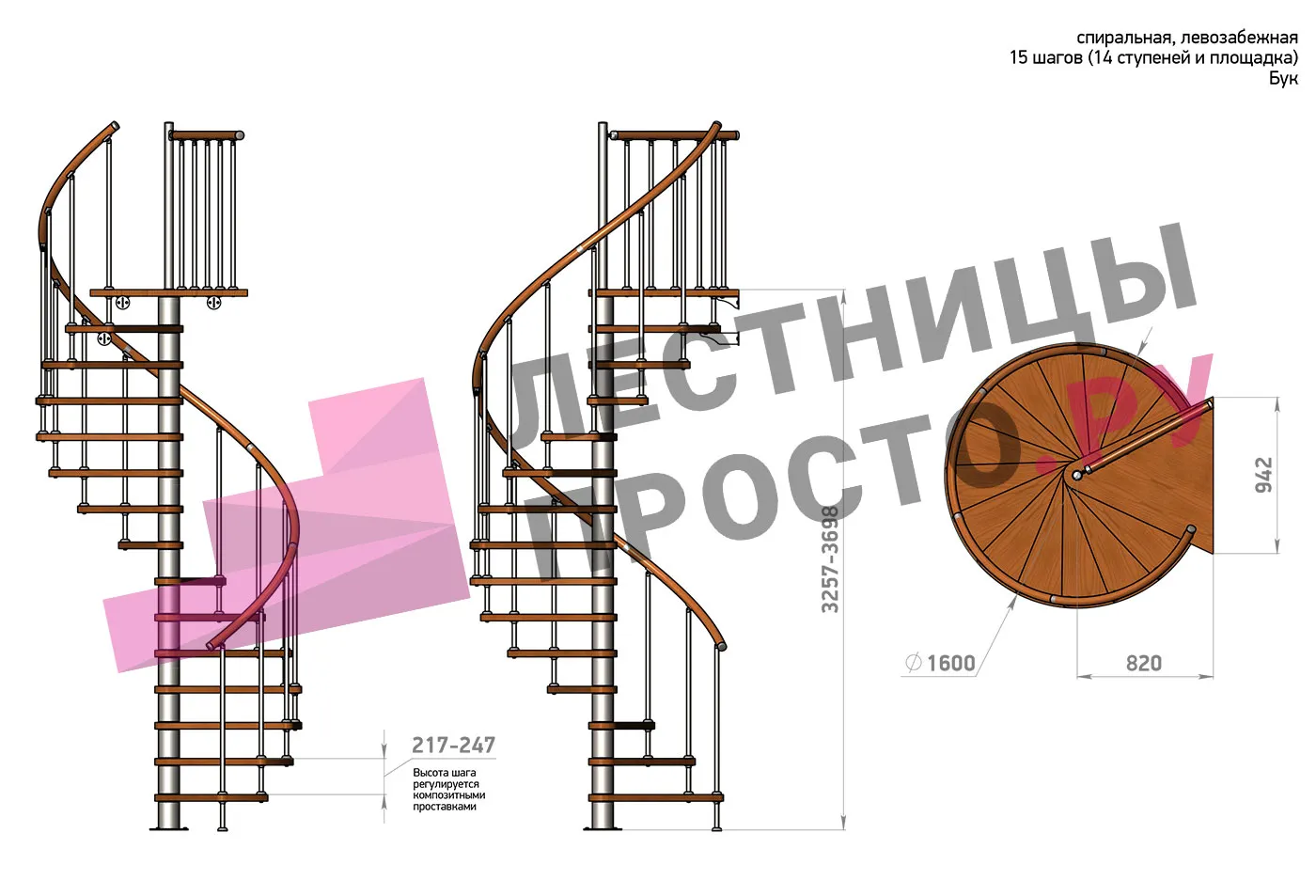 Винтовая лестница Prosto Spiral White D160см, h260.5-304.6 см, бук |