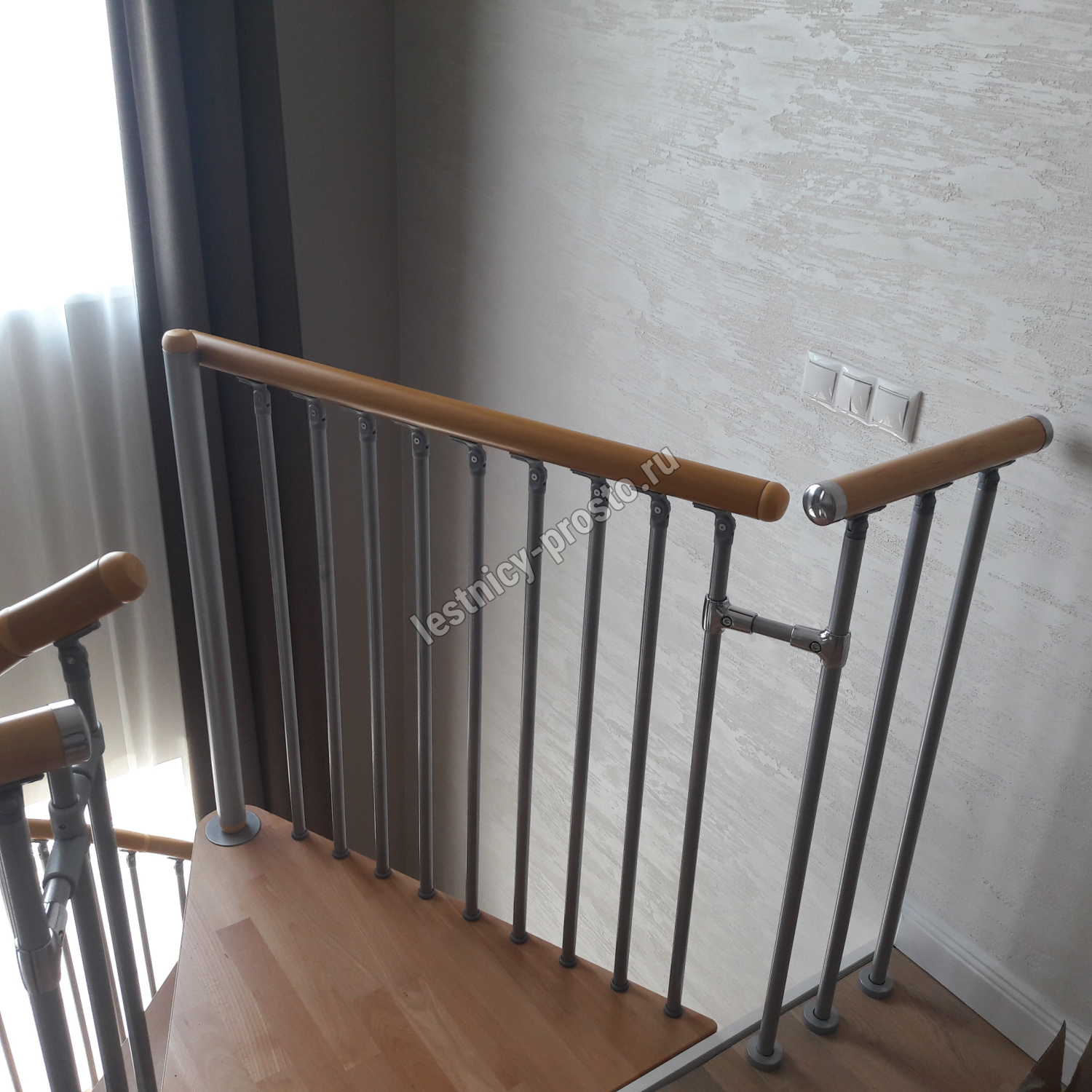 Поручень изготовлен из массива бука или дуба. Ступени и поручень лестницы покрыты износостойким бесцветным лаком.